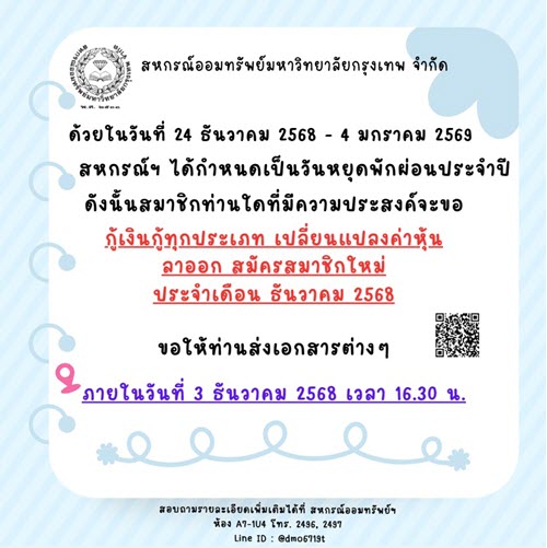 **เปลี่ยนแปลงค่าหุ้นยื่นเรื่องก่อนวันที่ 10 ช่วงเดือนพฤษภาคม และตุลาคม เงินกู้สามัญจ่ายทุกวันสิ้นเดือน