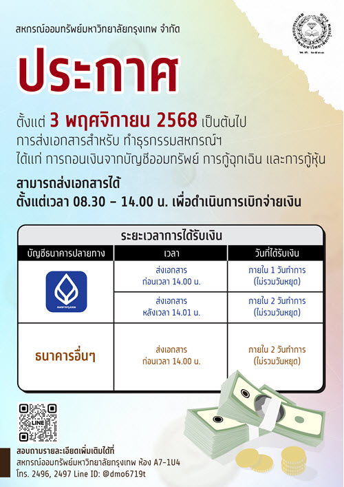ขอแจ้งเวลายื่นเอกสาร ทำธุรกรรมสหกรณ์ฯ